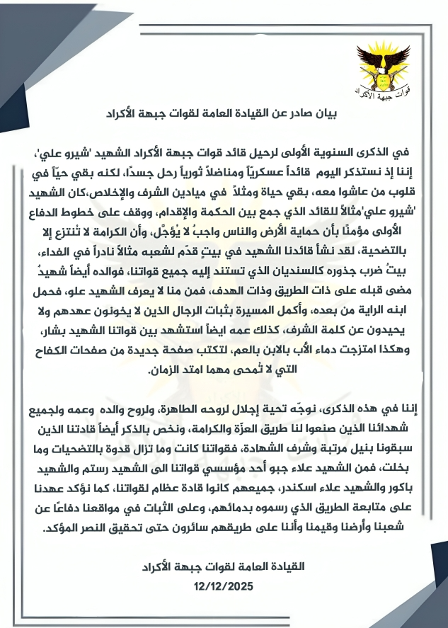 في الذكرى السنوية الأولى لرحيل قائد قوات جبهة الأكراد الشهيد ‘شيرو علي’، إننا إذ نستذكر اليوم قائداً عسكريّاً ومناضلاً ثورياً رحل جسدًا، لكنه بقي حيّاً في قلوب من عاشوا معه، بقي حياة ومثلاً في ميادين الشرف والإخلاص، كان الشهيد *شيرو علي* مثالًا للقائد الذي جمع بين الحكمة والإقدام، ووقف على خطوط الدفاع الأولى مؤمنًا بأن حماية الأرض والناس واجبٌ لا يُؤجَّل، وأن الكرامة لا تُنتزع إلا بالتضحية، لقد نشأ قائدنا الشهيد في بيتٍ قدّم لشعبه مثالًا نادراً في الفداء، بيتٌ ضرب جذوره كالسنديان الذي تستند إليه جميع قواتنا، فوالده أيضاً شهيدٌ مضى قبله على ذات الطريق وذات الهدف، فمن منا لا يعرف الشهيد علو، فحمل ابنه الراية من بعده، وأكمل المسيرة بثبات الرجال الذين لا يخونون عهدهم ولا يحيدون عن كلمة الشرف، كذلك عمه ايضاً استشهد بين قواتنا الشهيد بشار، وهكذا امتزجت دماء الأب بالابن بالعم، لتكتب صفحة جديدة من صفحات الكفاح التي لا تُمحى مهما امتد الزمان.