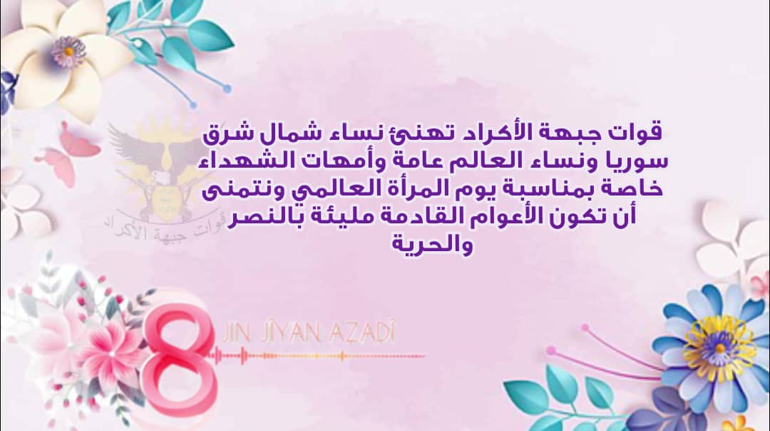 تهنئة بمناسبة يوم المرأة العالمي 8 آذار بمناسبة يوم المرأة العالمي في الثامن من آذار ، يطيب لنا في قوات جبهة الأكراد أن نتقدم بالتهنئة لكل نساء العالم ، وكلنا أمل أن يكون عاماً حافلاً بالإنجازات والتقدم على كافة الأصعدة التي كانت المرأة سباقة فيها . وفي هذا اليوم تتجدد فيها طاقات العمل لمناهضة العنف والممارسات ضدها والعمل لنيل حقوقها ودعمها وتقوية إرادتها . #قوات_جبهة_الأكراد #مكتب_الإعلام
